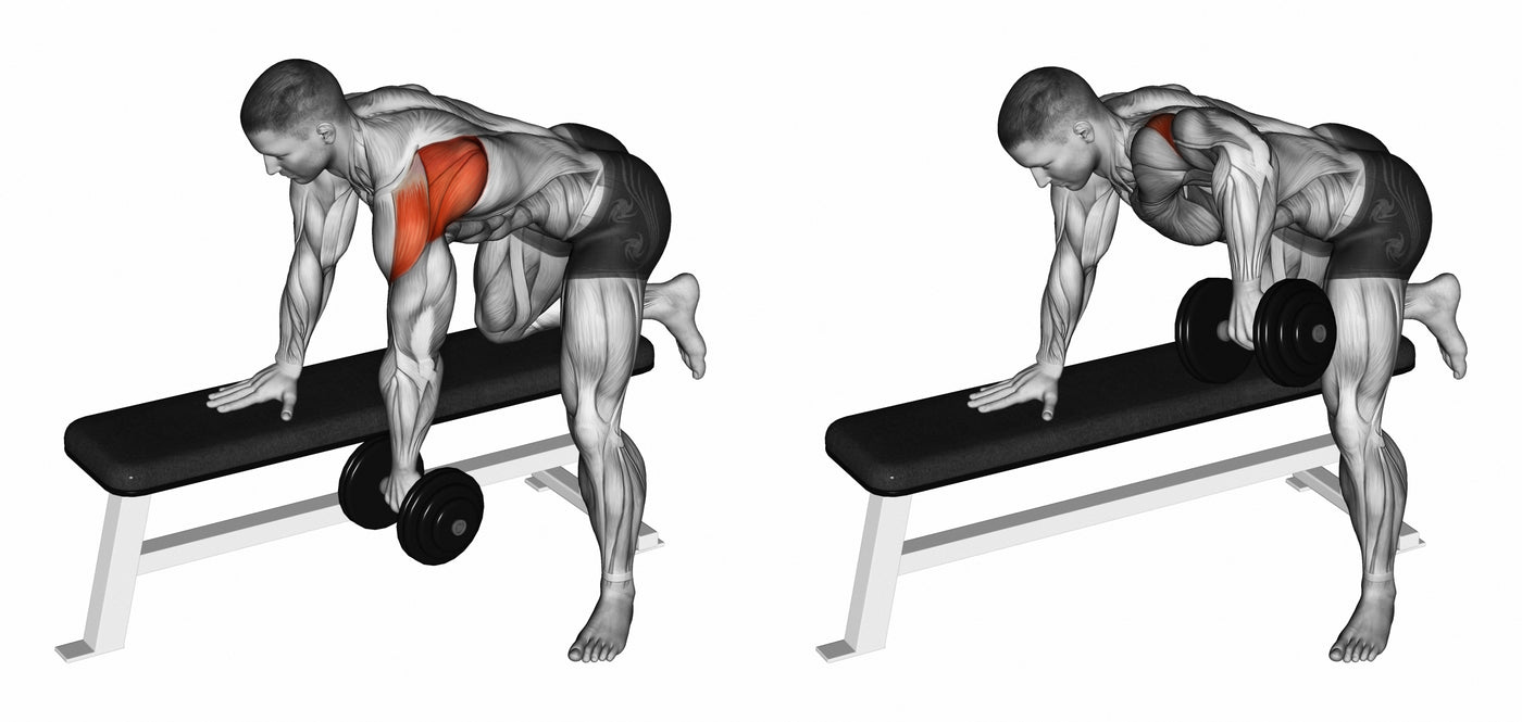 - Position: Performed in a bent-over position, supporting the upper body with one hand on a bench or other support while rowing a dumbbell with the opposite hand.