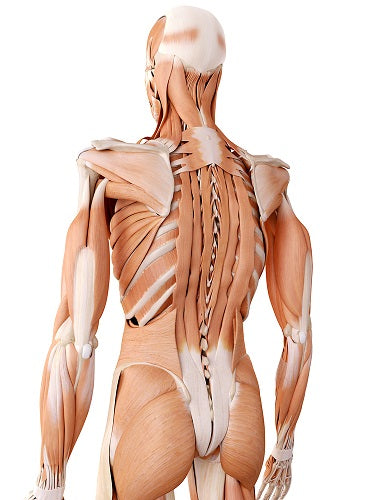 Extending upward, the muscle inserts into the vertebrae, ribs, and the base of the skull, spanning a significant portion of the spine.