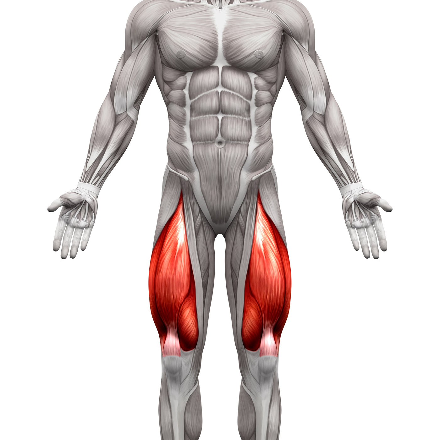 The quadriceps femoris group, located on the anterior (front) side of the thigh includes the rectus femoris, vastus lateralis, vastus medialis, and vastus intermedius muscles, which extend the knee.