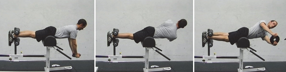 This is an advanced exercise that is used to strengthen the lower back muscles in trunk (shoulder) rotation to the rear. This exercise is basically the same as the back raise with a twist except that you maintain a horizontal position and rotate while holding a plate weight in the hands rather than a pole across the shoulders.