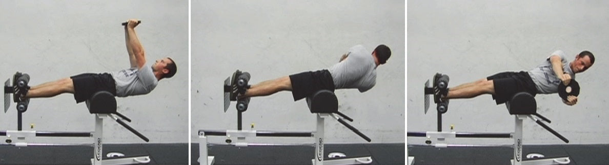 In this exercise there is shoulder girdle rotation, which actively involves the internal oblique and external oblique. In this action you rotate your shoulders a full 180 degrees from a starting horizontal position. The rectus abdominis and the erector spinae contract isometrically to hold your trunk level in the horizontal position and stabilize the trunk.