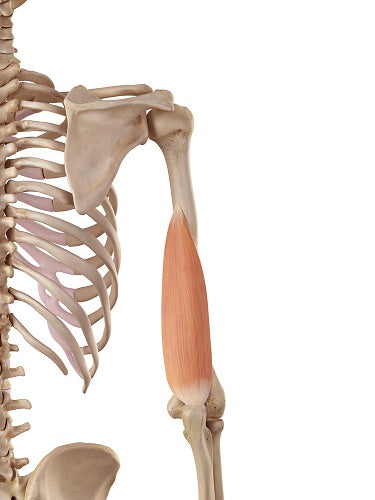 The primary function of the medial head of the triceps brachii is extension at the elbow joint. It works in coordination with the other heads of the triceps brachii to straighten the arm. This muscle is particularly active during activities involving pushing and extending the elbow, contributing to strength and stability during various upper limb movements.